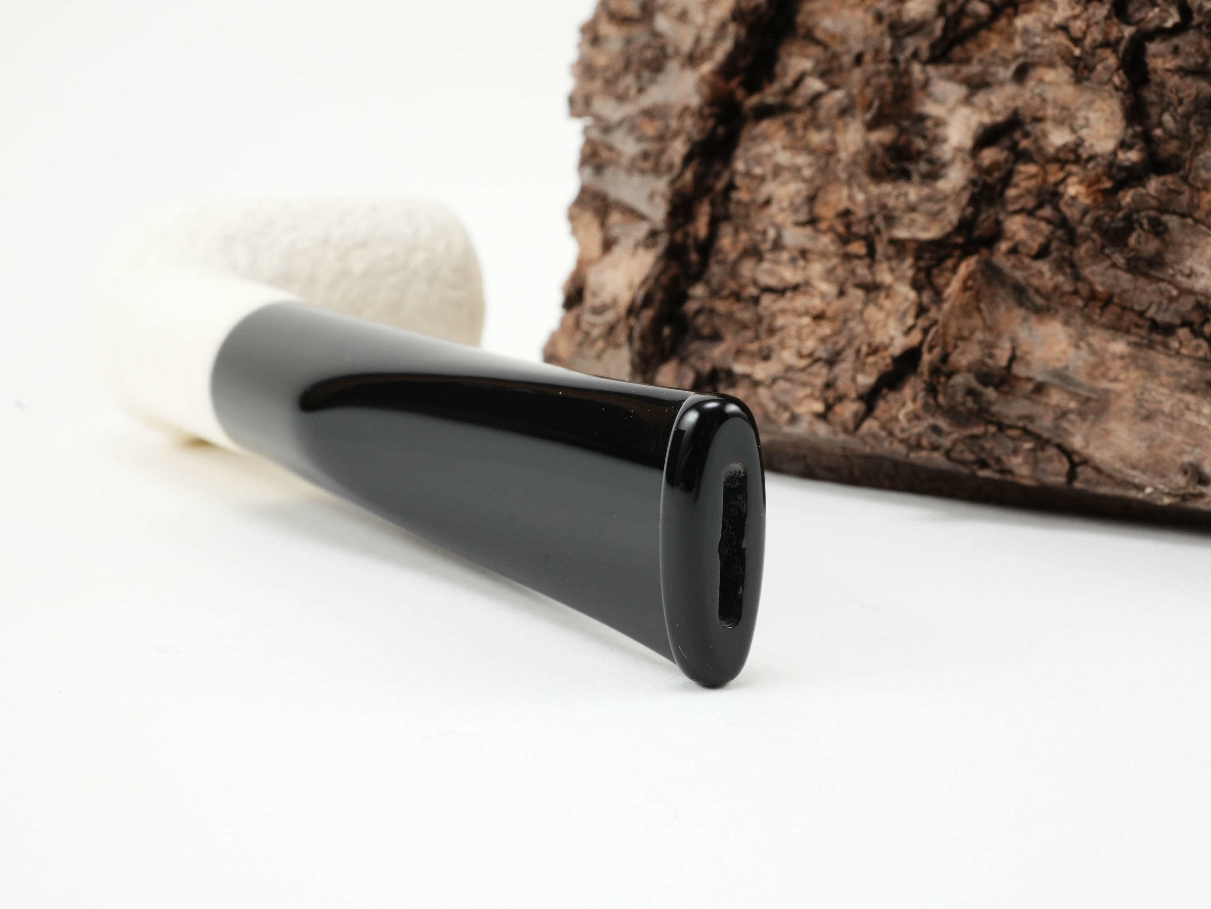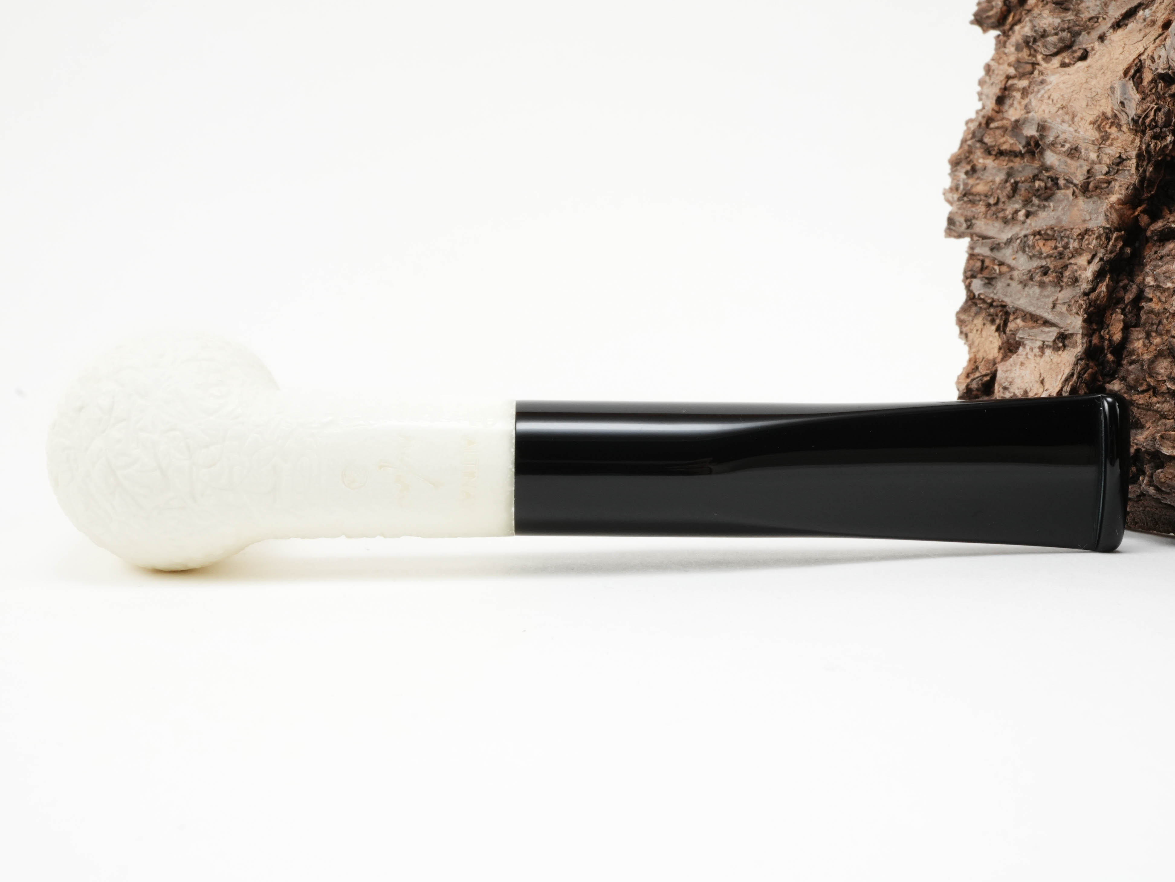 Die Altinay Block-Meerschaumpfeife #23 hat ein schwarzes Mundstück aus Acryl und eine feine Rustizierung.
