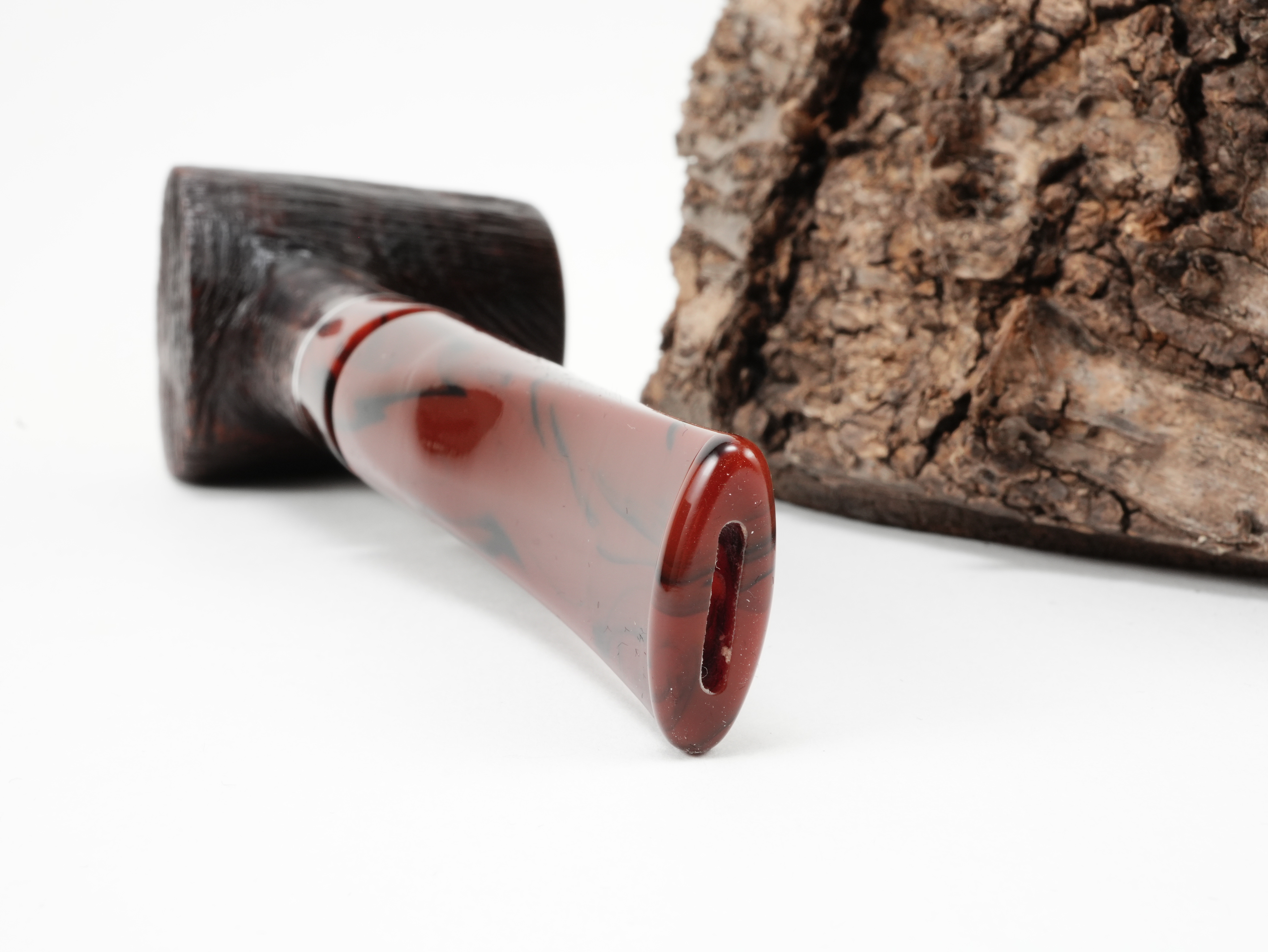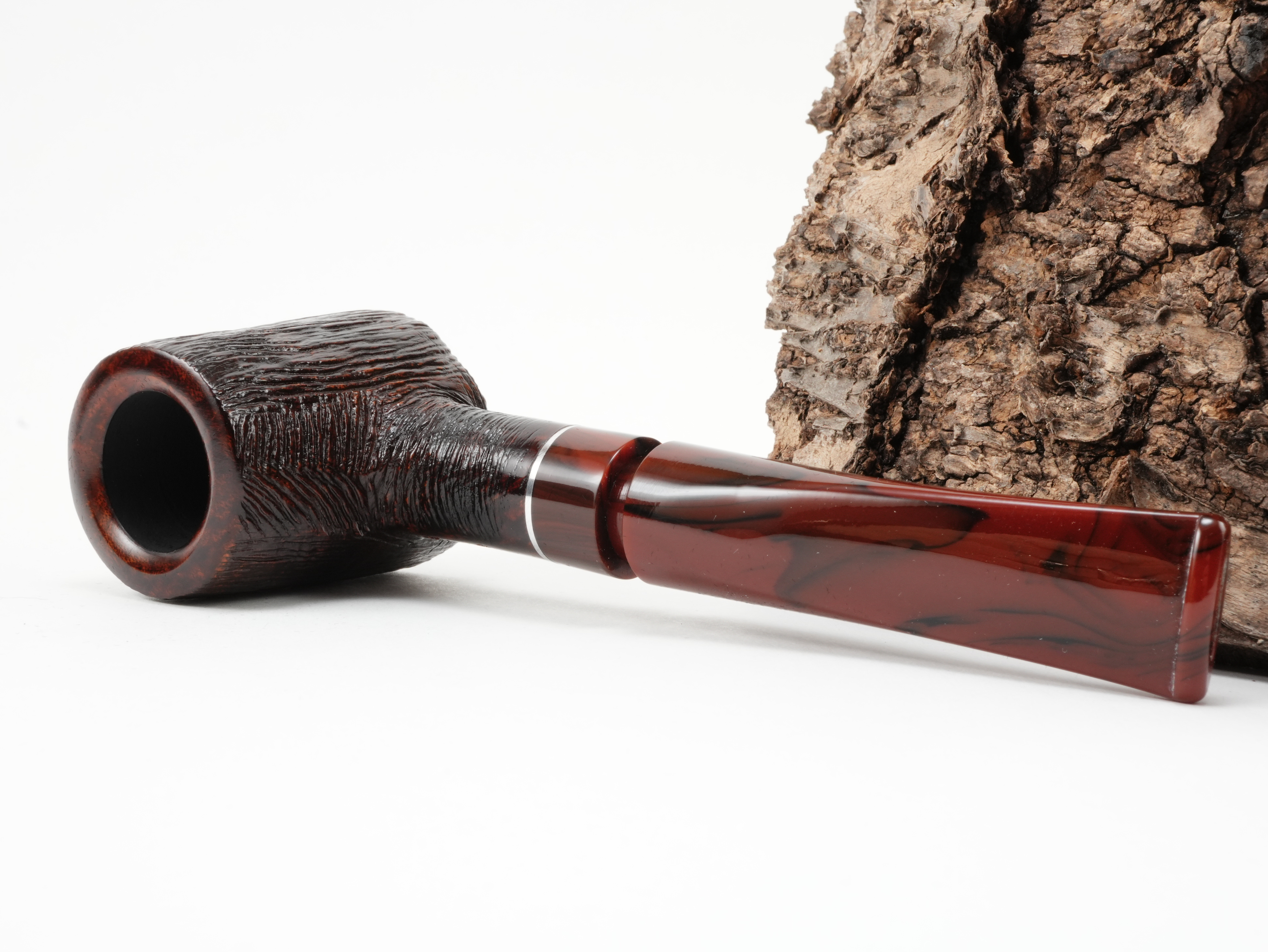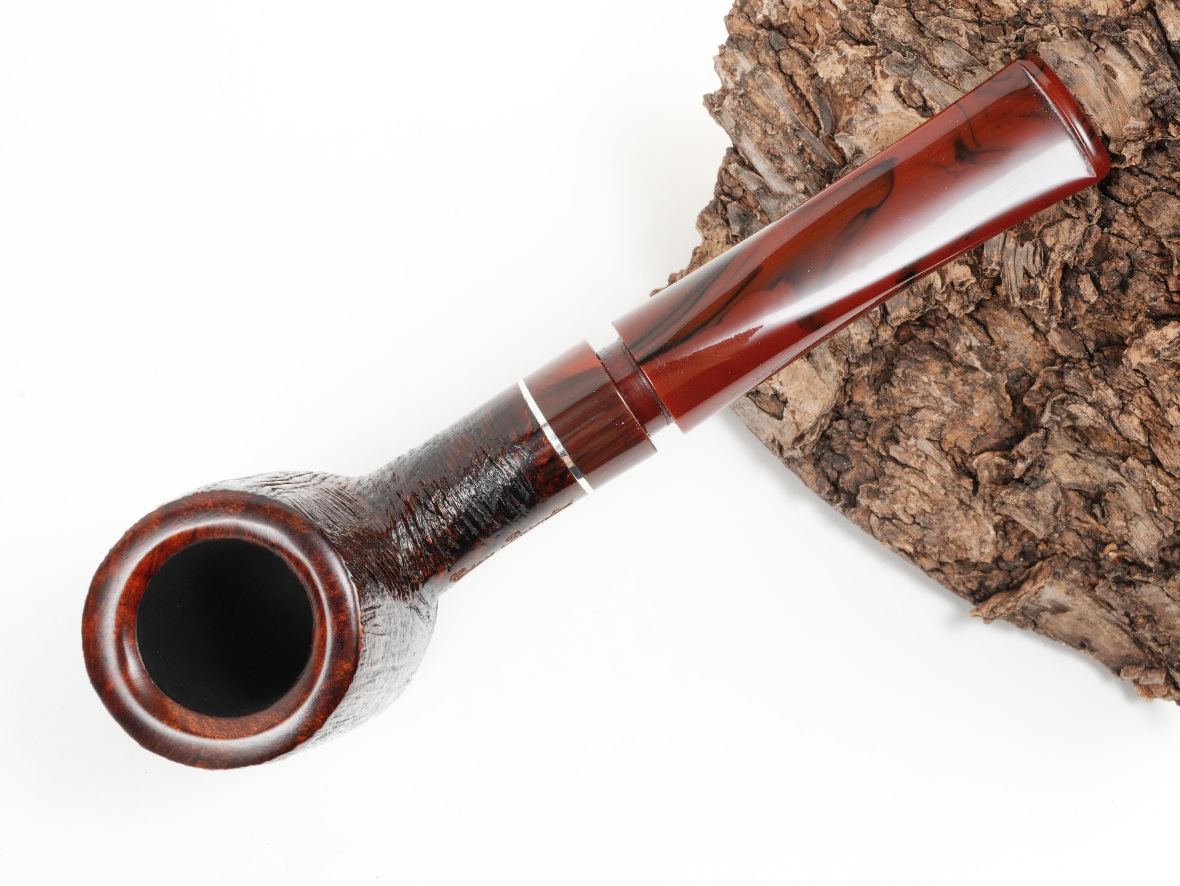 Eine stilvolle Pfeife in klassischem Farbton. Sowohl das Mundstück, also auch die Applikation ist aus Acryl in Cumberlandoptik.