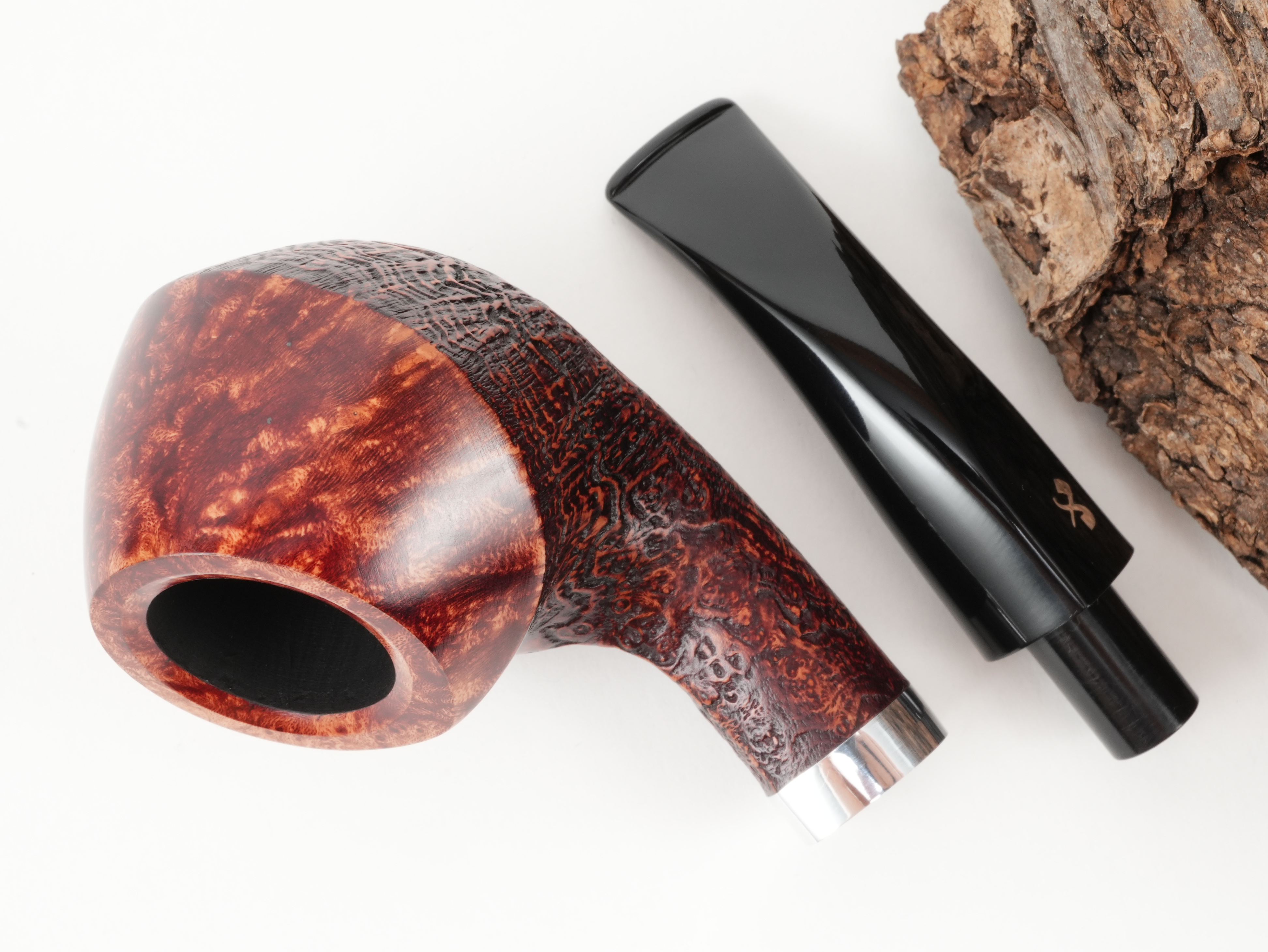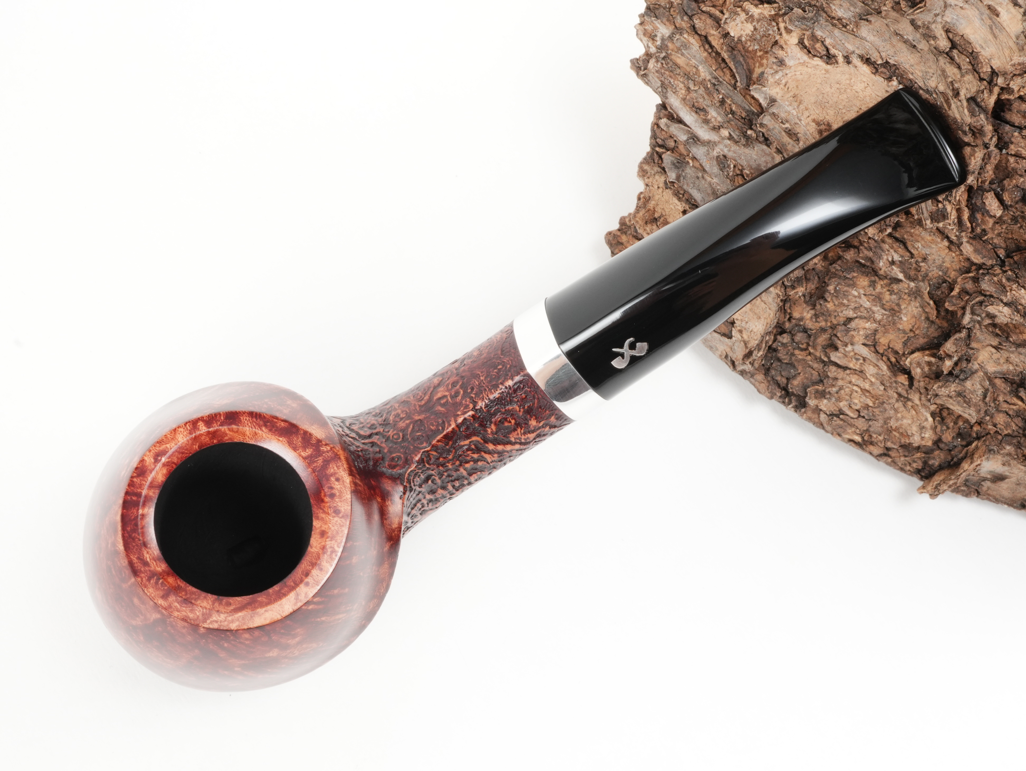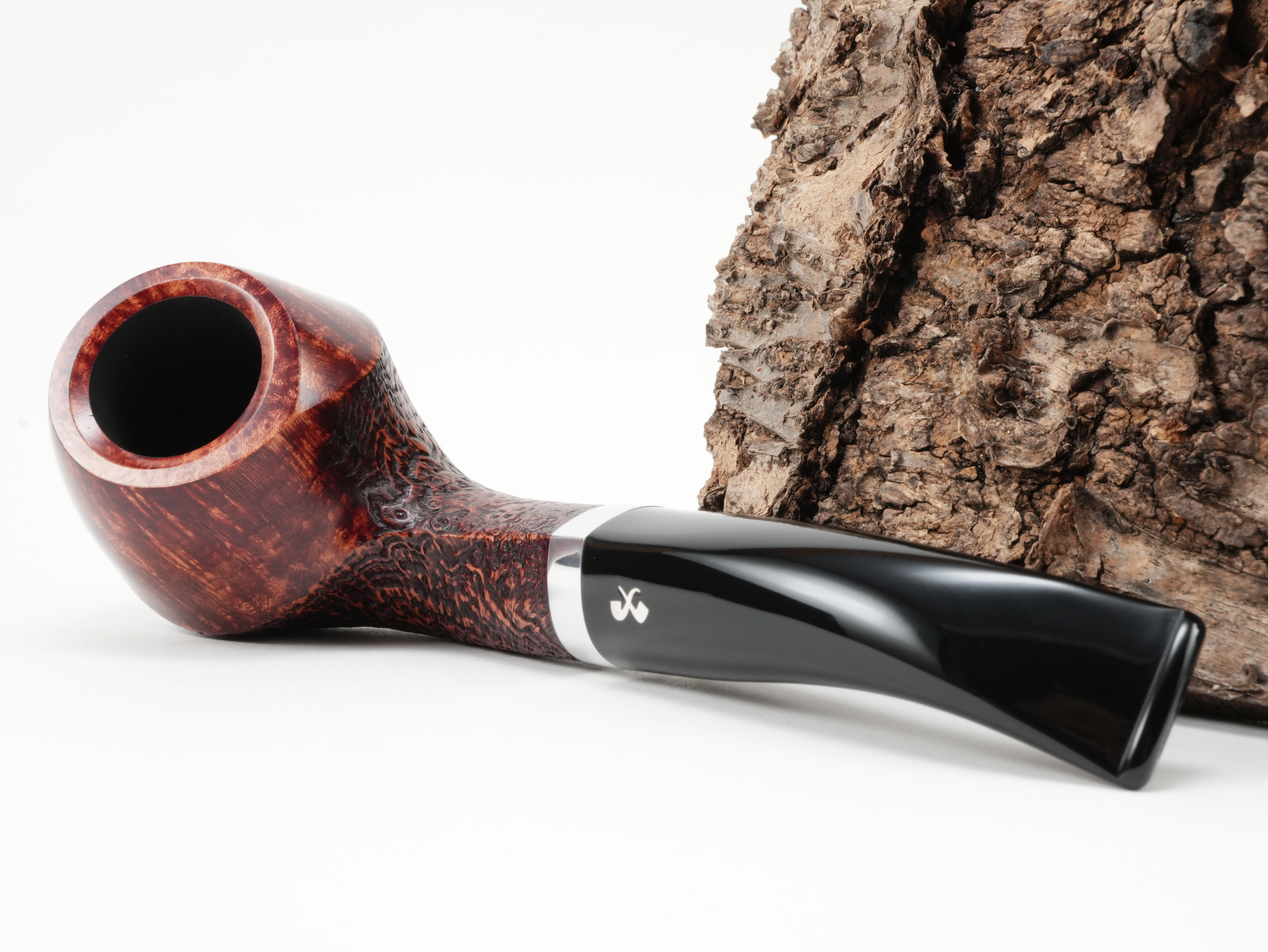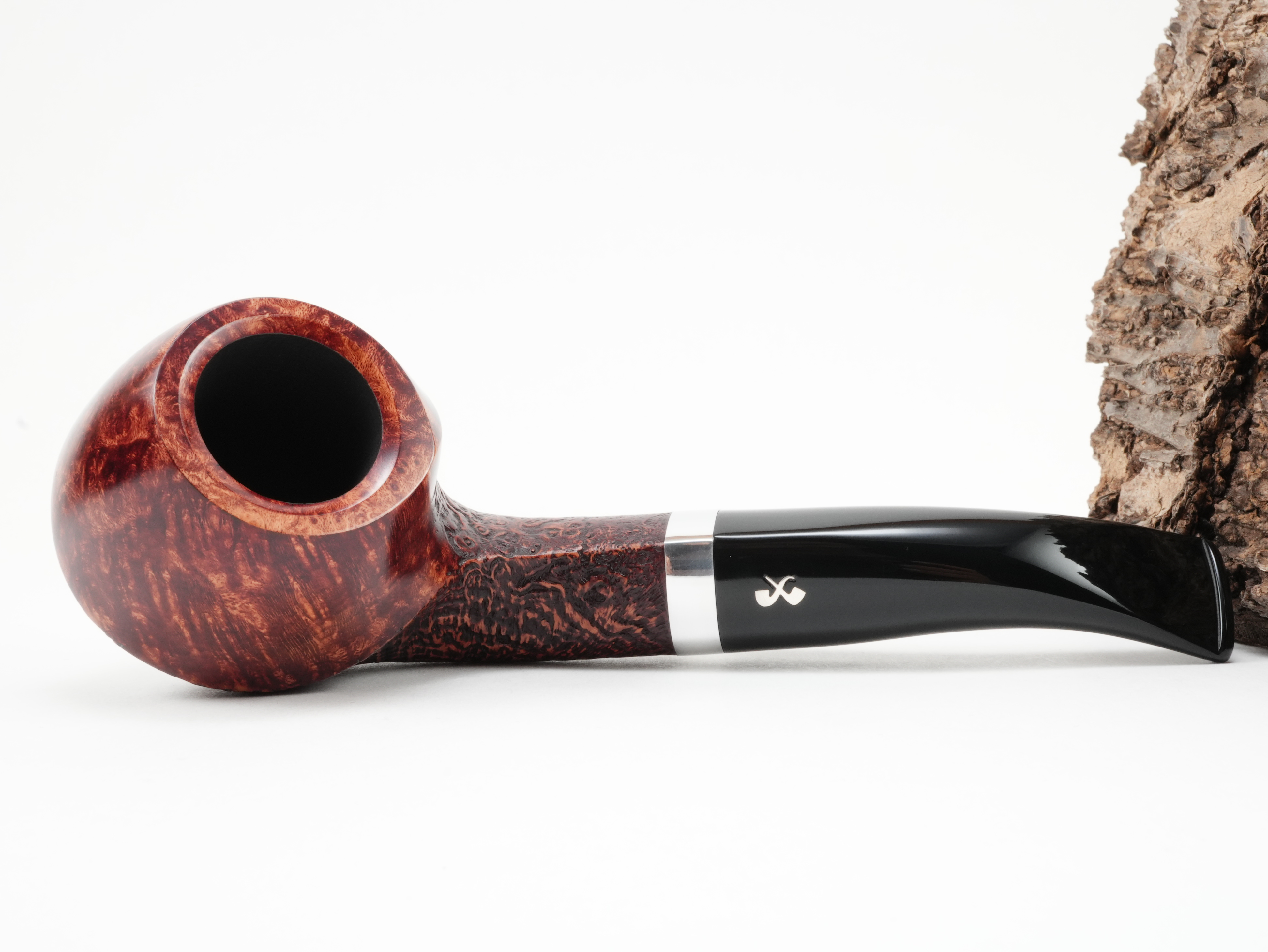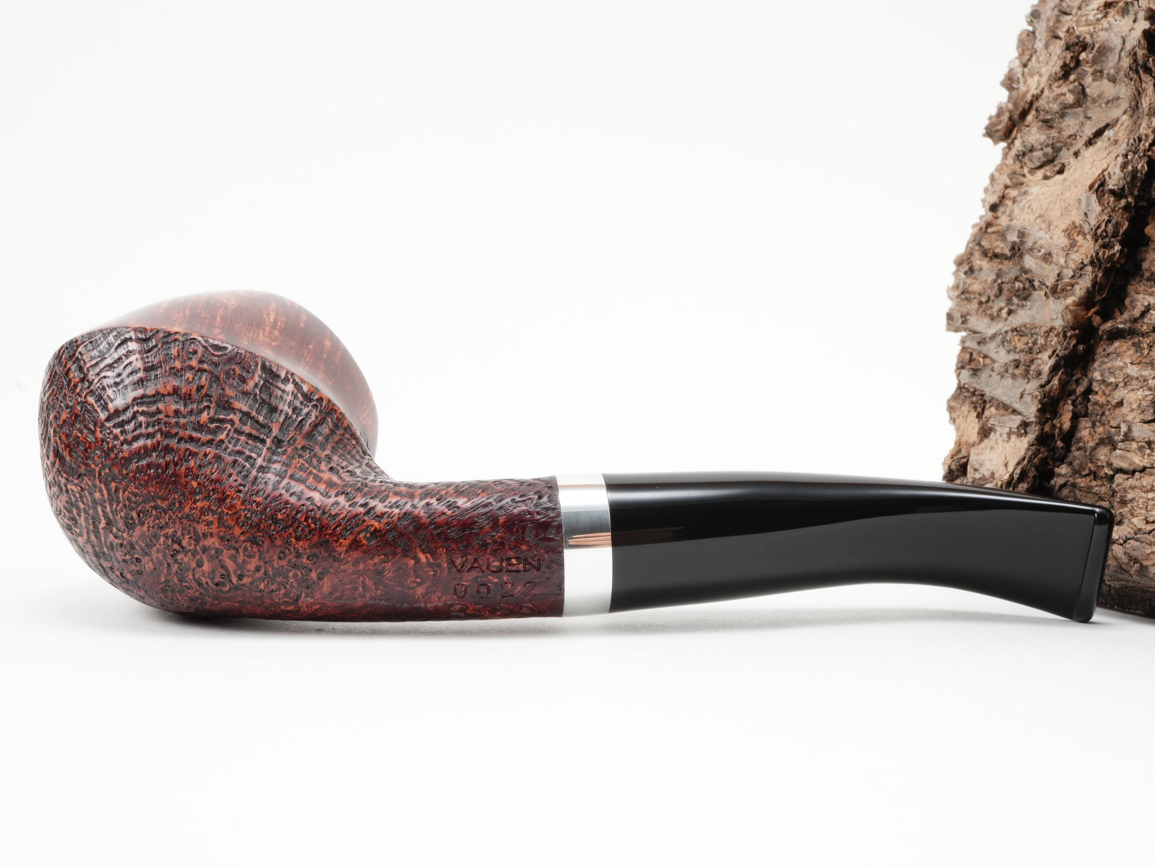 Die Vauen Jahrespfeife 2026 CU ist ein teilsandgestrahltes Modell mit runden Formen. Das Logo ist in echtem Silber eingelassen.